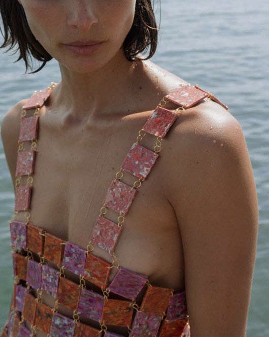 An example of projects undertaken by the students is Natalia Soto’s proposal: The local community collects their own raw material, microplastics, from the beaches of Santa Marta, Colombia, transforms it, and gives it new life in the form of a reinterpretation of the iconic Paco Rabanne dress, now handcrafted and created from modular pieces, thus forming the new garment (Fig. 1). With this scalable prototype, the ecosystem is restored and the economy is revitalised by offering the local community a job opportunity throughout the entire production process.